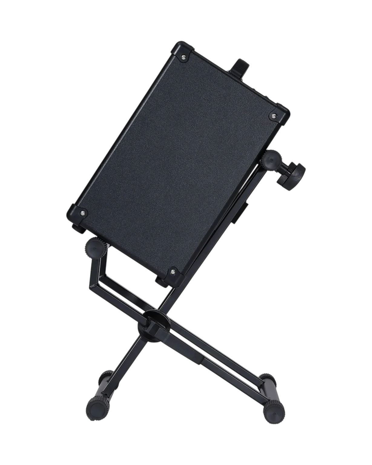 Este soporte cuenta con inclinación ajustable y brazo telescópico que permite adaptarse a diferentes tamaños de amplificadores. Además, su diseño plegable facilita el transporte y almacenamiento, mientras que sus patas ajustables ofrecen mayor estabilidad incluso en superficies irregulares.